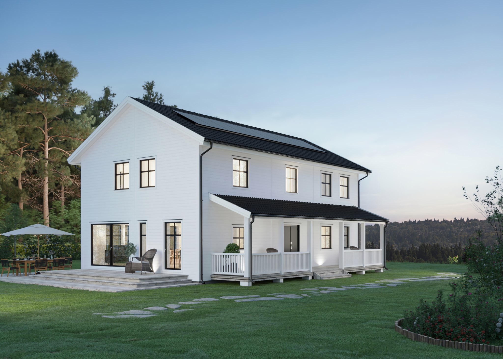 Det planerade huset är ett modernt tvåplanshus på 194 kvm med 6–7 rum, vilket ger generösa ytor och flexibilitet. Huset har fullhöjd på övervåningen och möjlighet till upp till fem sovrum. Skön golvvärme och låg energiförbrukning är standard, och alla fönster i aluminium ger låga framtida kostnader. För barn med leklust ger den öppna planlösningen mellan hall, kök och vardagsrum stora möjligheter att leka och springa runt. Köket har plats för ett stort matbord eller en rejäl köksö, och en altandörr bjuder in till morgonfika i trädgården. Övervåningen har lutande ryggåstak på 2,4–4 meter och flexibla ytor. Uteplats kan skapas på flera av husets sidor. Hallen erbjuder smarta förvaringslösningar, och på entréplanet kan du välja mellan ett eller två sovrum – eller skapa större sällskapsytor. Som köpare kan du påverka både planlösning, material och färgval, vilket gör huset helt anpassningsbart efter din livsstil.