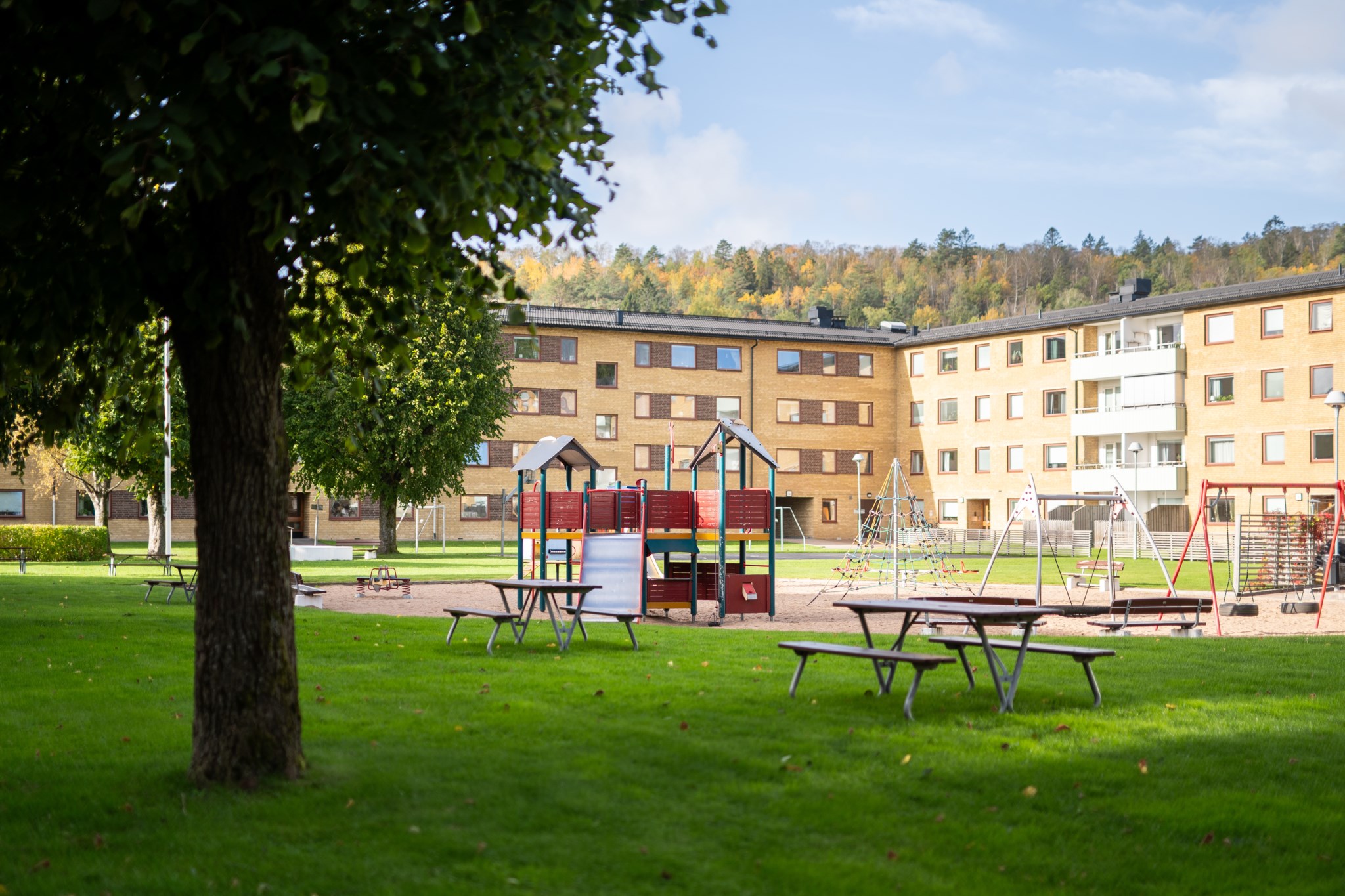 Fin lekplats med kompisgunga, klätterställning, balansbana och basketkorg.